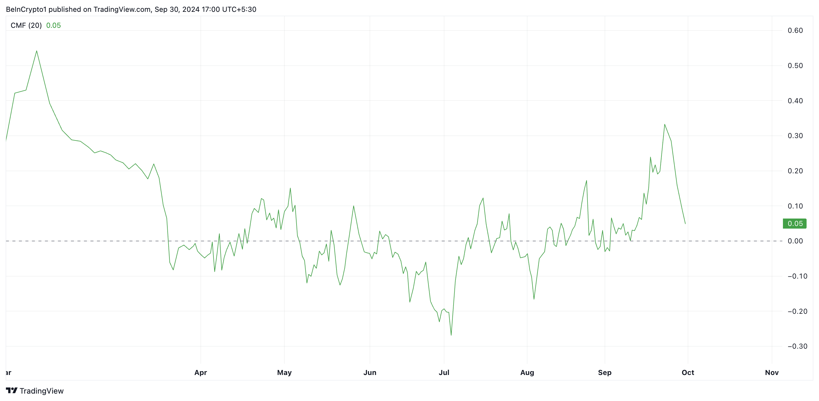 Selain itu, Chaikin Money Flow (CMF) SHIB berada di ambang masuk ke wilayah negatif, menandakan potensi aliran keluar likuiditas. CMF, yang melacak uang masuk dan keluar dari pasar, sedang tren menurun, berada di 0,05 saat ini. Setup ini menunjukkan bahwa aliran keluar likuiditas dari pasar SHIB sedang mempercepat.