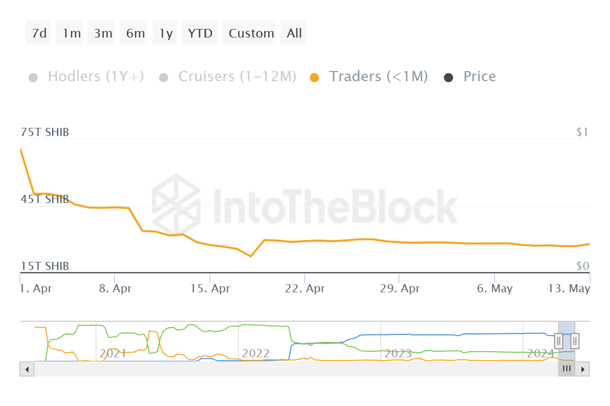 Sentimen ini semakin diperkuat oleh fakta bahwa bahkan investor jangka pendek pun bertingkah bullish. Total kepemilikan mereka telah menyusut sebesar 1 triliun SHIB (US$22,3 juta lebih) dalam kurun waktu tiga minggu.