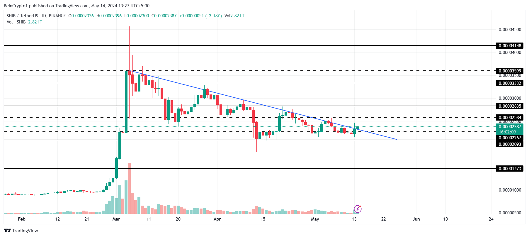 Harga Shiba Inu saat ini (US$0,00002387) sedang berkitar di atas support kritis di US$0,00002093. Level ini telah bertahan kokoh untuk sementara waktu, begitu pula dengan garis tren turun. Untuk saat ini, SHIB sedang memulai breakout, yang jika didukung oleh investor, mampu memantik reli harga.