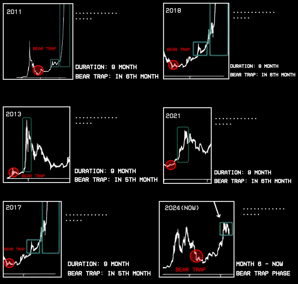 Menurut analis kripto pseudonim Finish, siklus bull run Bitcoin biasanya berlangsung sekitar sembilan bulan. Bear trap seringkali muncul pada bulan keenam dalam siklus ini. Selama fase ini, harga Bitcoin anjlok brutal, memicu kepanikan serta aksi jual besar-besaran. Namun, setelahnya, harga kembali pulih dan mencetak level tertinggi baru.