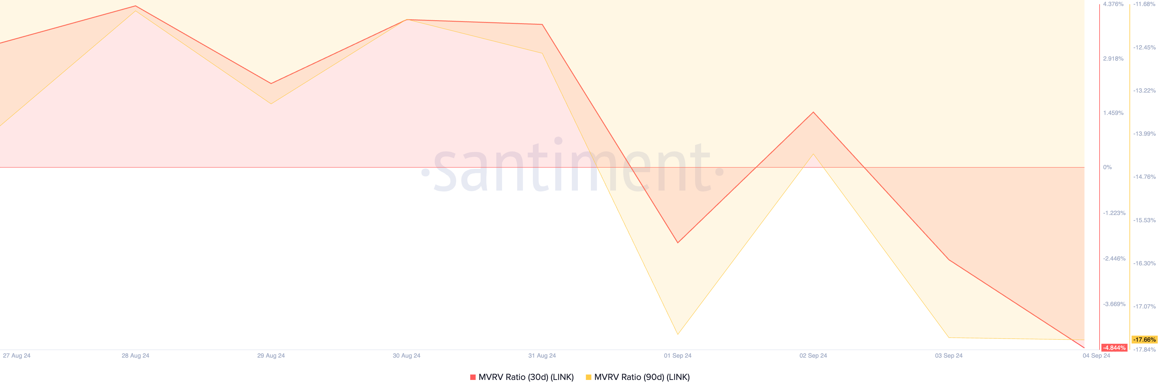 Analisis ini didasarkan pada rasio market value to realized value (MVRV) dari LINK selama 30 hari dan 90 hari. Data dari Santiment menunjukkan bahwa rasio MVRV 30 hari dan 90 hari LINK berada di -4,84% dan -17,66%.