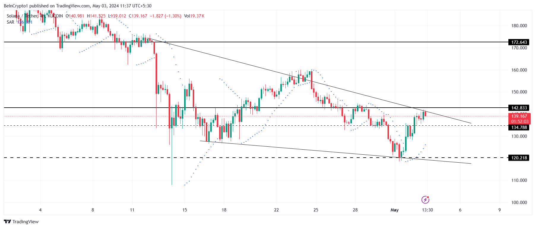 Harga Solana, yang saat ini diperdagangkan di US$139, membentuk wedge menurun yang mungkin akan segera breakout. Observasi ini mendapat dukungan dari Relative Strength Index (RSI). RSI sendiri bertugas mengukur kecepatan dan perubahan pergerakan harga.
