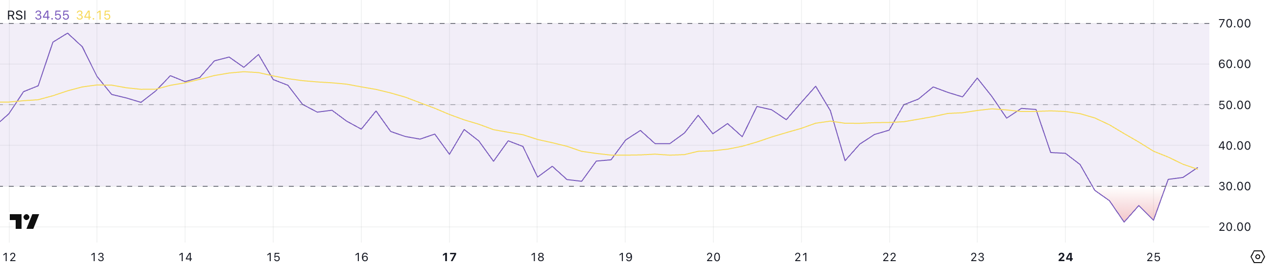 RSI SHIB saat ini berada di 34,5, setelah turun ke 21,6 beberapa jam yang lalu. Ini menandai penurunan tajam dari 56,5 hanya dua hari yang lalu.
