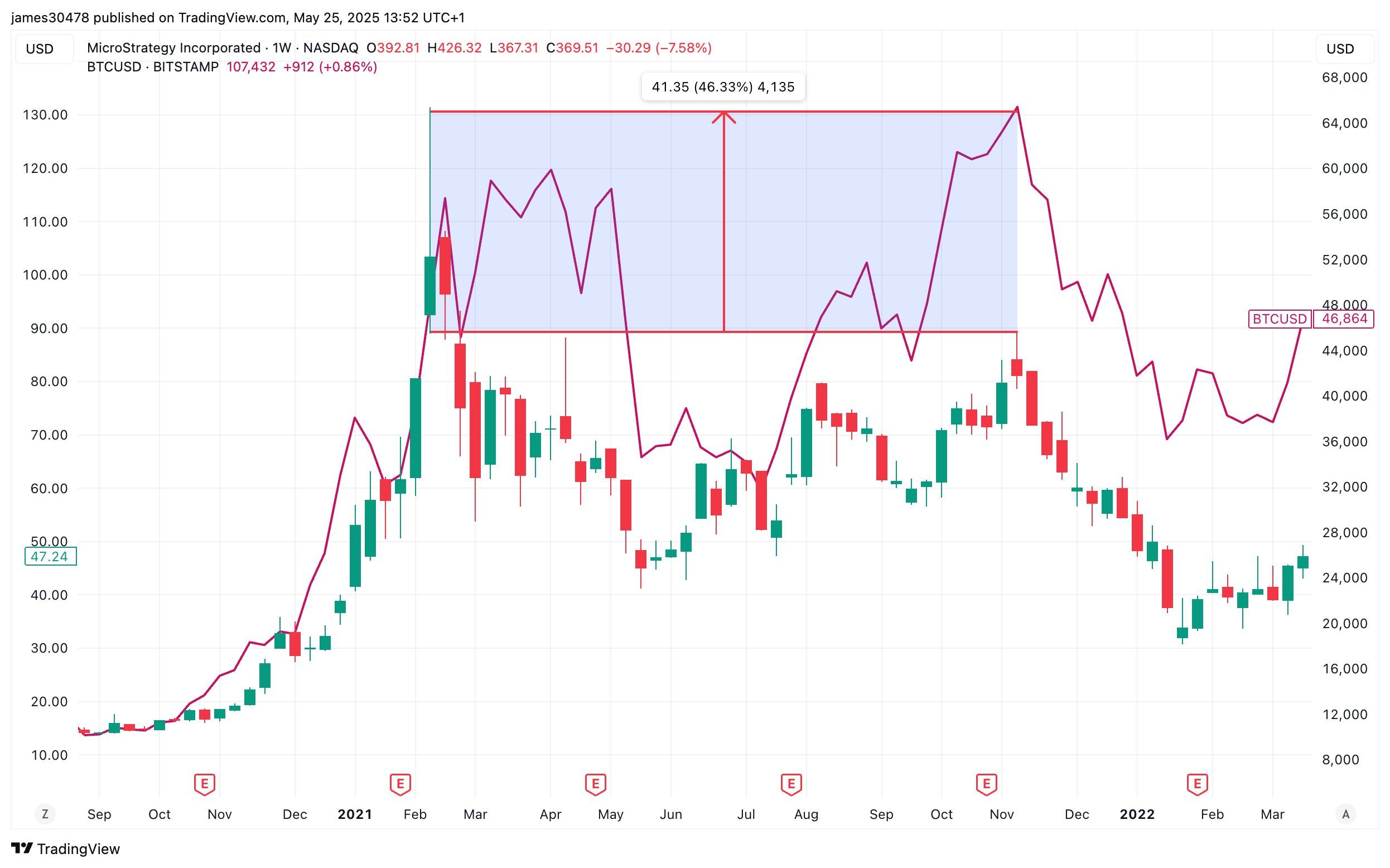 Grafik menunjukkan bahwa pada November 2021, MSTR turun sekitar 50% dari puncak sebelumnya, sementara Bitcoin mencapai rekor tertinggi baru sebesar US$69.000. Skenario serupa sedang terjadi sekarang. MSTR telah menyelesaikan penurunan 50% dari puncak akhir 2024, namun Bitcoin terus mencapai rekor baru di atas US$111.000.