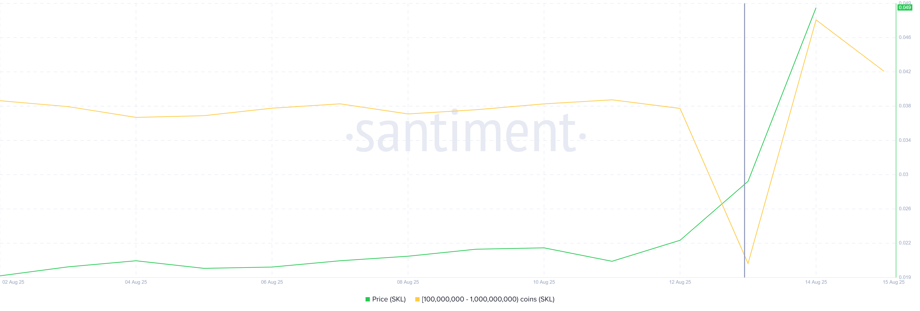 Aktivitas whale semakin optimistis terhadap Skale. Alamat yang memegang antara 100 juta hingga 1 miliar token SKL mengumpulkan lebih dari 200 juta token hanya dalam 24 jam. Pembelian ini, senilai lebih dari US$8,6 juta, menunjukkan kepercayaan holder besar terhadap masa depan altcoin ini.