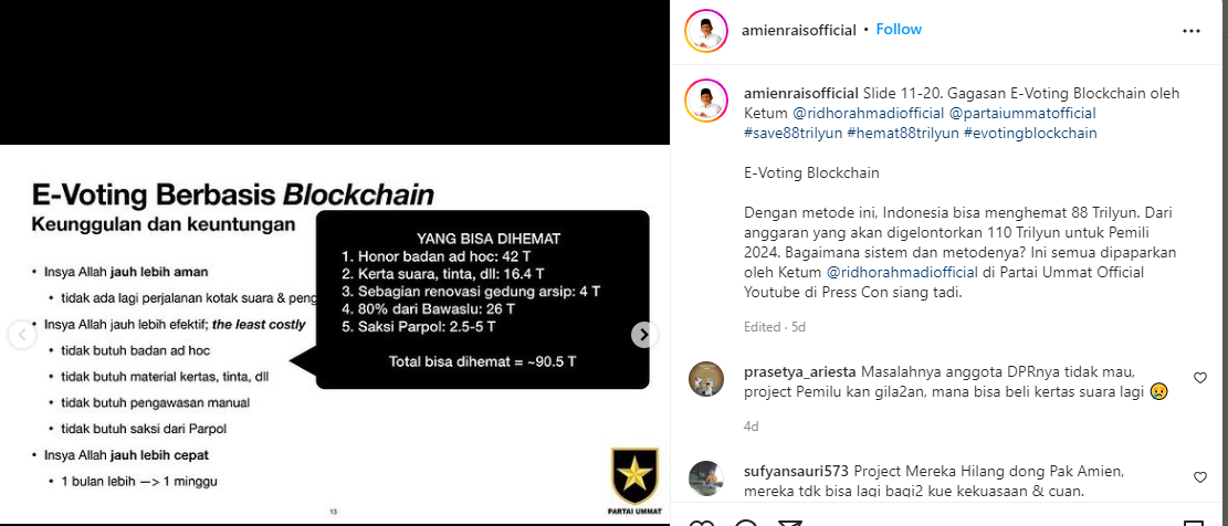 Mantan Ketua Umum PP Muhammadiyah itu mengungkapkan bahwa proses Pemilu bisa menggunakan skema e-voting berbasis blockchain. Lewat mekanisme tersebut, Amien optimistis bahwa negeri ini bisa menghemat anggaran lebih dari Rp88 triliun.