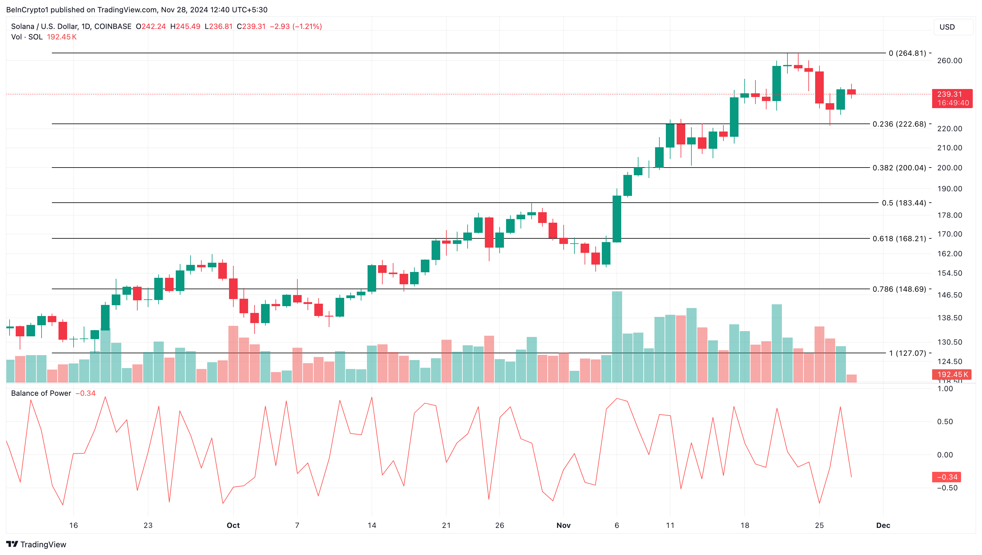 Upaya Solana (SOL) untuk mencapai kembali harga tertinggi sepanjang masa menghadapi resistance kuat. Di sisi lain, upaya ini juga memungkinkan bear Solana menekan harga lebih rendah karena terus berputar di sekitar US$238.