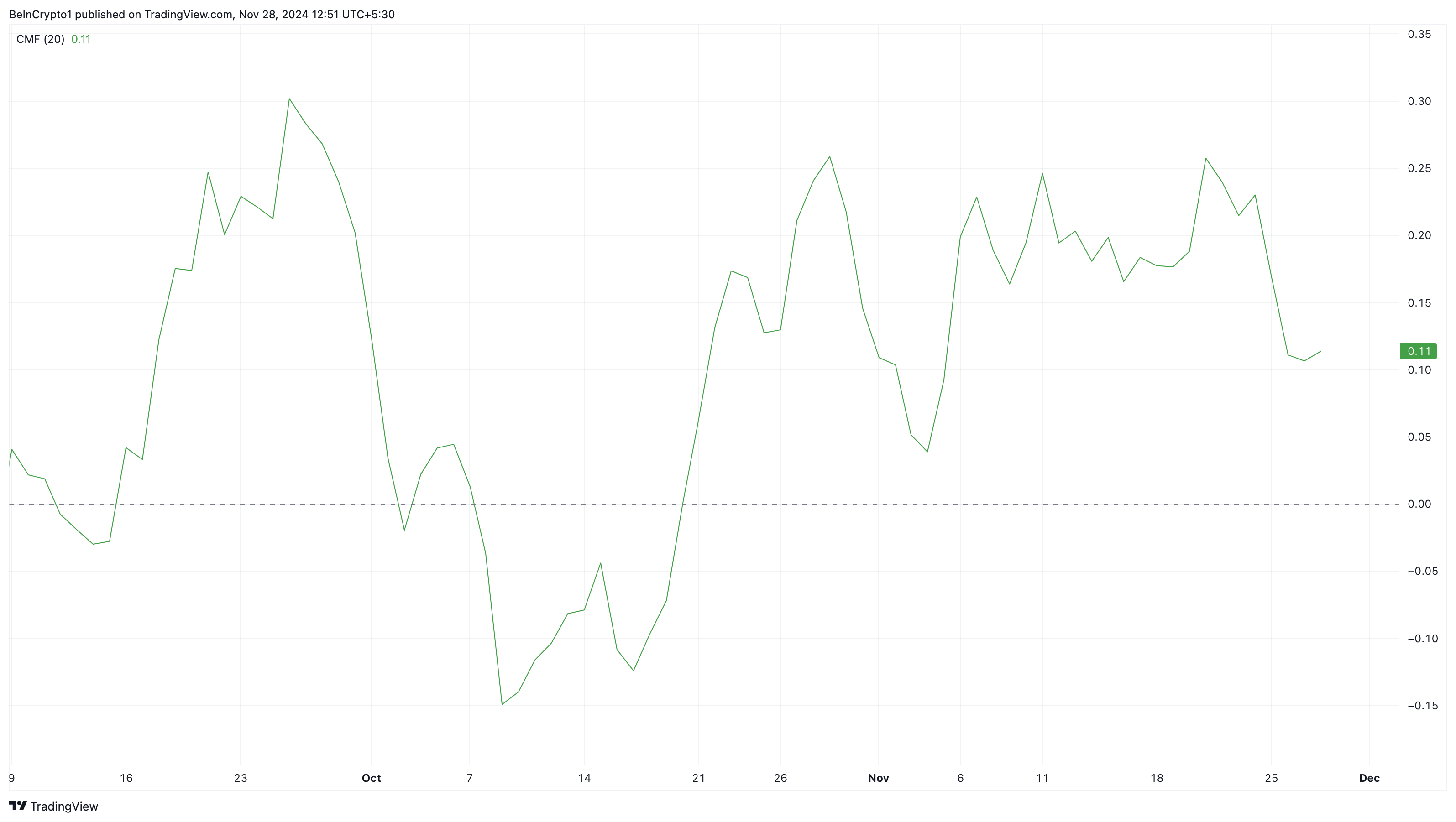 CMF yang meningkat menunjukkan tekanan beli yang meningkat, menunjukkan potensi kenaikan harga. Sebaliknya, CMF yang menurun mencerminkan tekanan jual yang meningkat dan aliran keluar modal, yang biasanya menunjukkan penurunan harga.