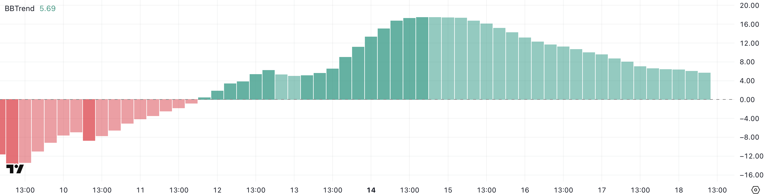SponsoredNilai yang lebih tinggi menunjukkan pergerakan yang kuat dan terarah (baik naik atau turun), sementara nilai yang lebih rendah menunjukkan tren yang lebih lemah dan volatilitas yang berkurang. Dengan BBTrend sekarang di 5,69, Solana berada di lingkungan yang jauh kurang volatil, yang sering kali mendahului breakout atau pembalikan.