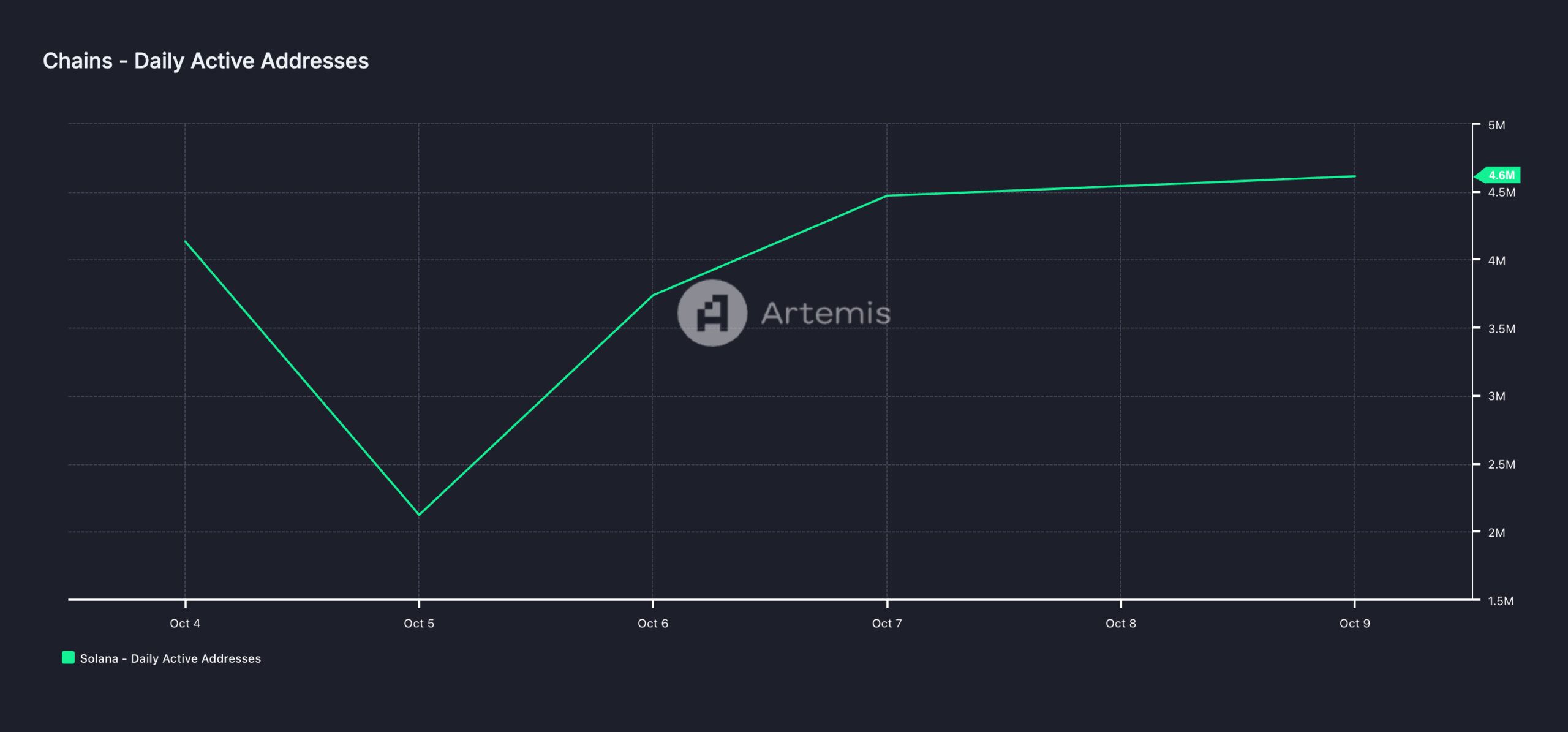 Sejak 5 Oktober, jumlah harian alamat unik yang telah menyelesaikan setidaknya satu transaksi jaringan Solana telah meningkat sebesar 12%. Lonjakan ini terjadi setelah kemerosotan yang berkepanjangan dalam aktivitas pengguna di L1.