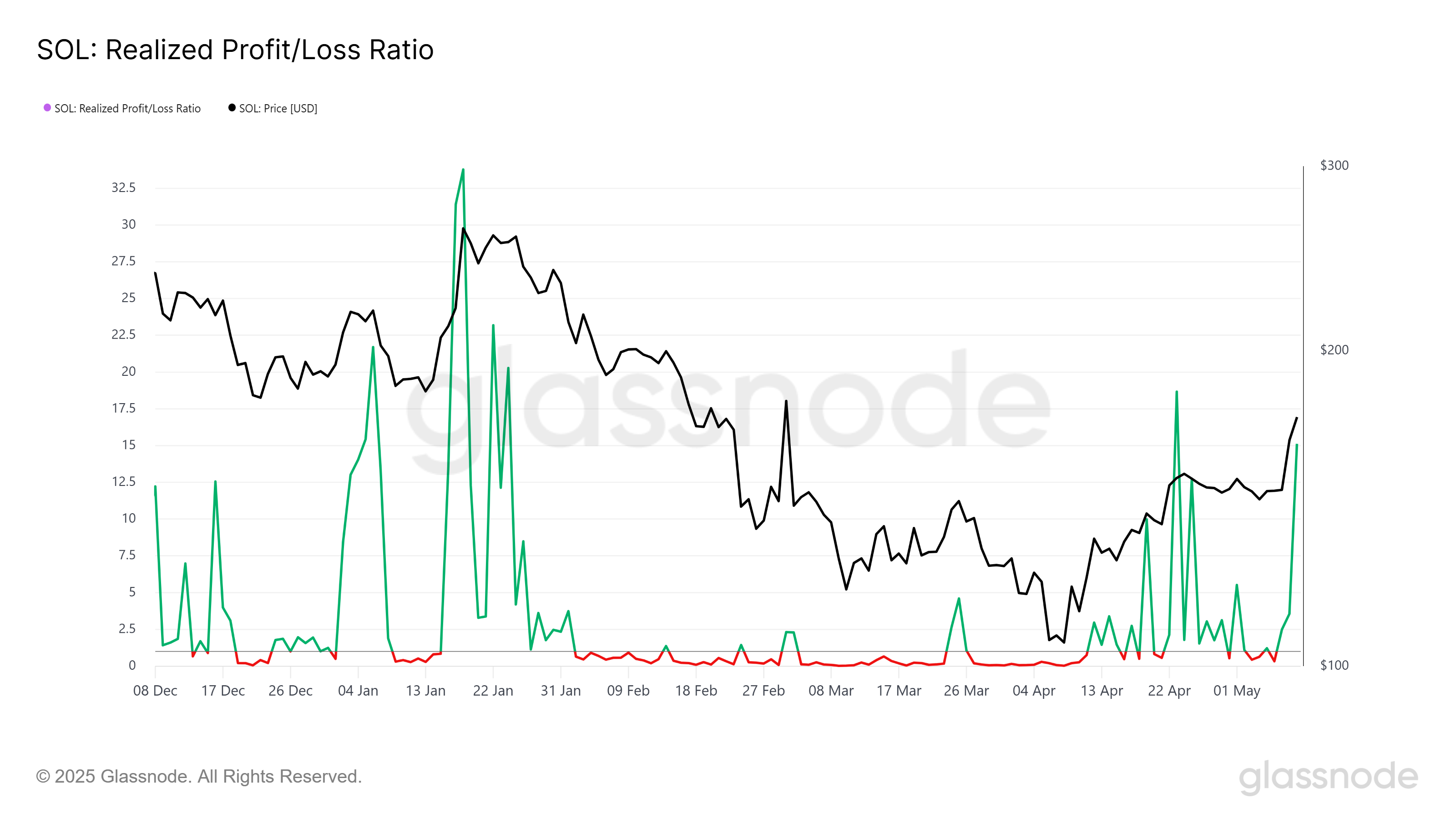 Banyak holder Solana (SOL) memilih untuk mengambil keuntungan, yang berkontribusi pada peningkatan rasio Realized Profit/Loss. Indikator ini telah melonjak ke 15,0, menandakan bahwa penjualan berlebihan bisa menjadi perhatian. Secara historis, ketika rasio ini melewati ambang 10,0, sering kali menyebabkan koreksi harga jangka pendek.