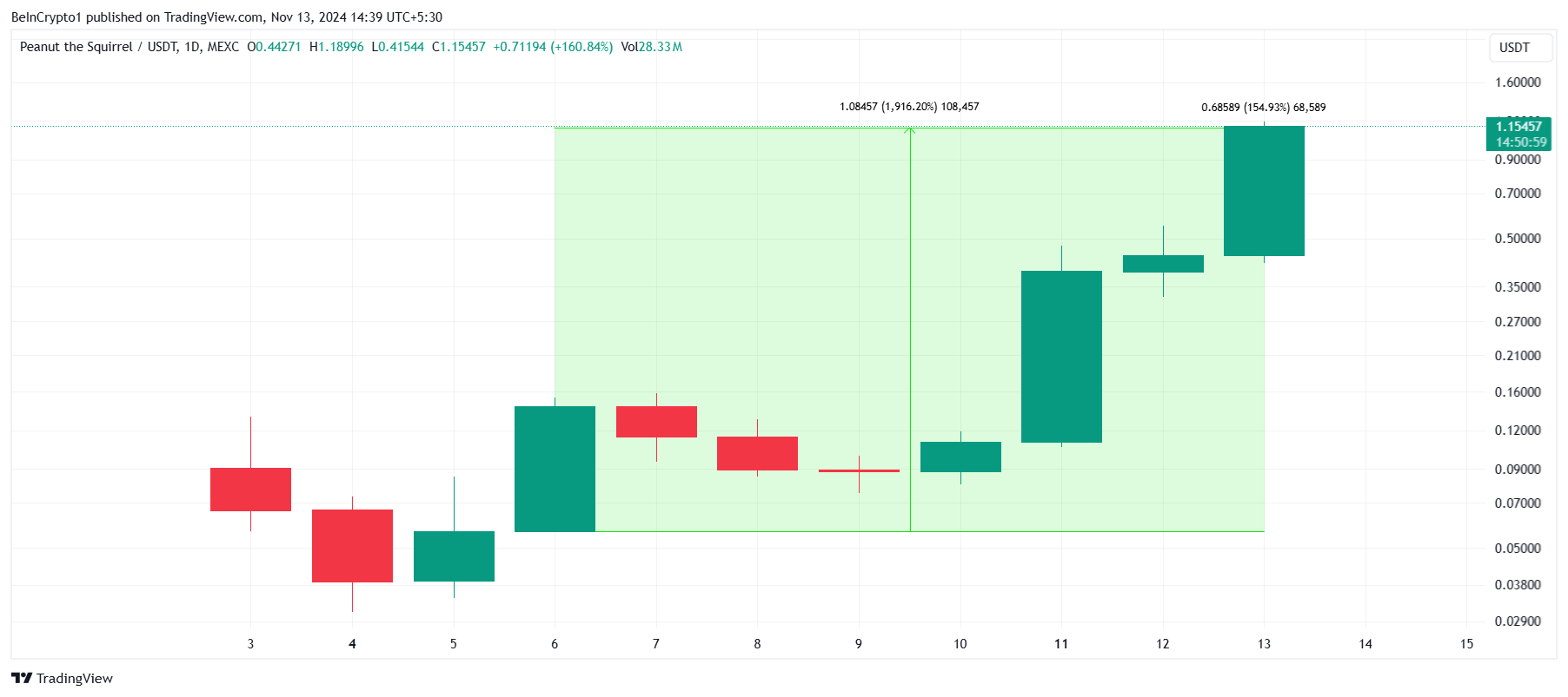 Harga PNUT melonjak 154% pada hari Rabu, menambah keuntungan minggu ini dan membawa harga perdagangannya menjadi US$1,15. Kenaikan ini adalah bagian kunci dari reli berkelanjutan yang telah mendorong keuntungan token hampir 2.000%, dan tidak menunjukkan tanda-tanda melambat.