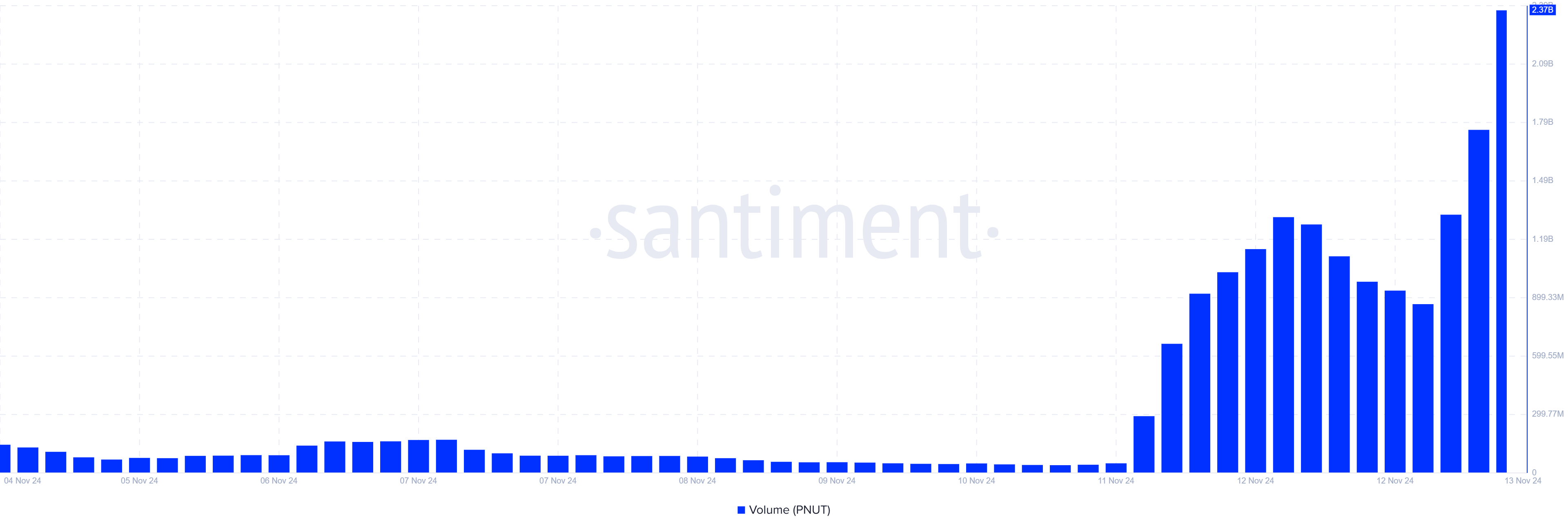Permintaan untuk PNUT terlihat jelas dalam volume perdagangannya, yang telah melonjak 690% dalam 36 jam. Awalnya, volume perdagangan PNUT berada di US$291 juta namun melonjak menjadi US$2,3 miliar, menunjukkan peningkatan minat terhadap meme coin ini. Lonjakan volume perdagangan menunjukkan peningkatan selera investor, terutama mengingat peluncuran PNUT yang baru-baru ini.
