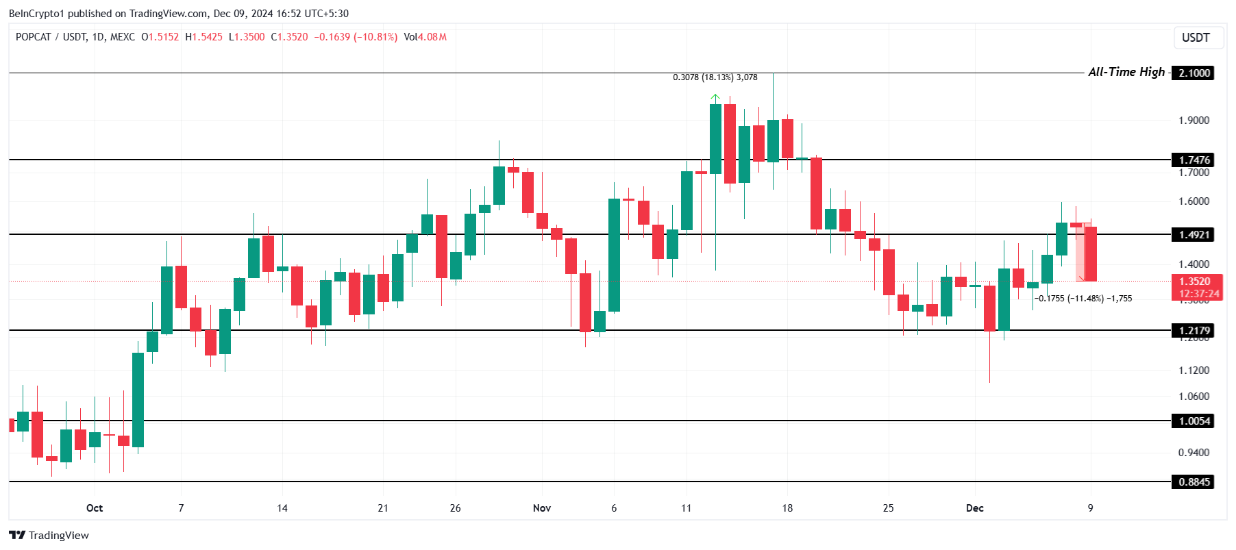 Harga POPCAT baru-baru ini mengalami penurunan 11,4% dalam 24 jam terakhir, menjadikannya salah satu yang paling merugi di pasar. Meskipun gagal mempertahankan US$1,49 sebagai support, altcoin ini tetap di atas US$1,21. Aksi harga ini penting karena memiliki potensi untuk mendukung tren naik di masa depan untuk meme coin Solana.