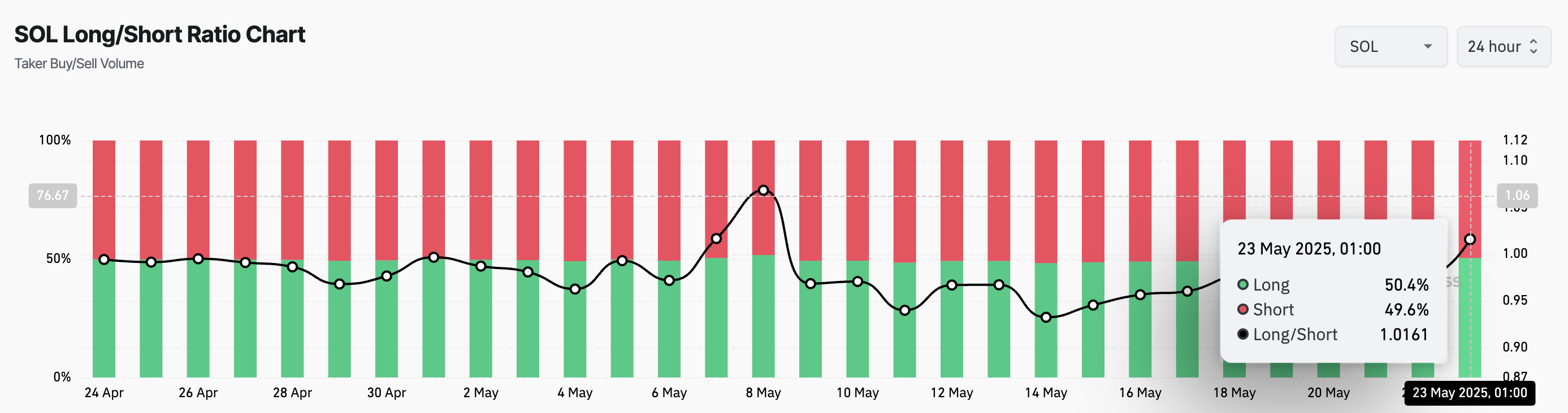 Rasio long/short SOL telah naik kembali di atas 1 untuk pertama kalinya sejak 8 Mei. Ini menandakan minat baru untuk posisi long di kalangan trader futures dan menunjukkan perubahan sentimen pasar menuju ekspektasi bullish. Pada waktu publikasi, rasio ini berada di 1,01.