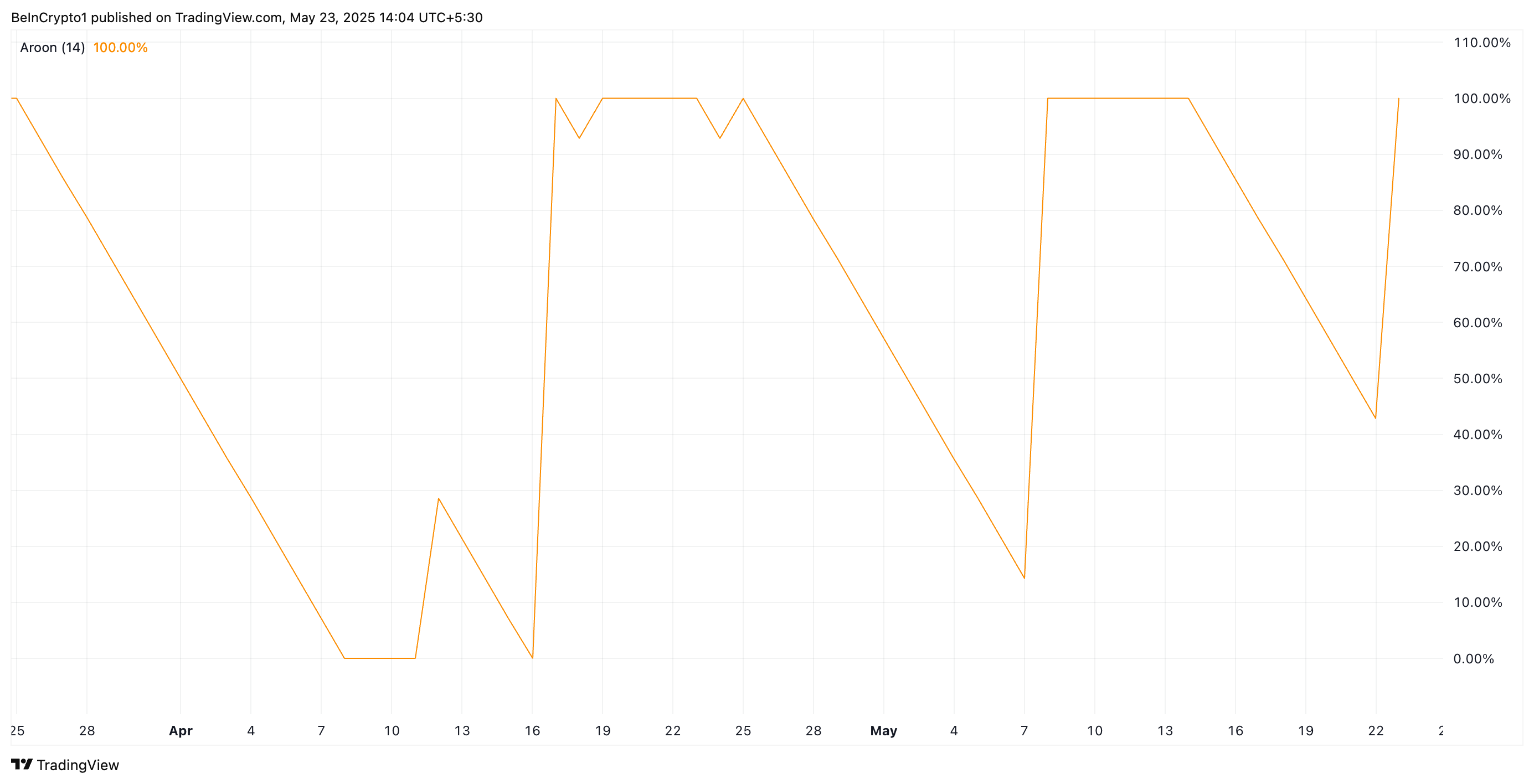 Ketika garis Aroon Up mencapai 100 atau mendekatinya, aset yang dimaksud baru saja mencatatkan harga tertinggi baru. Ini berlaku untuk SOL, yang diperdagangkan pada harga tertinggi sembilan hari sebesar US$185,32 pada waktu publikasi.