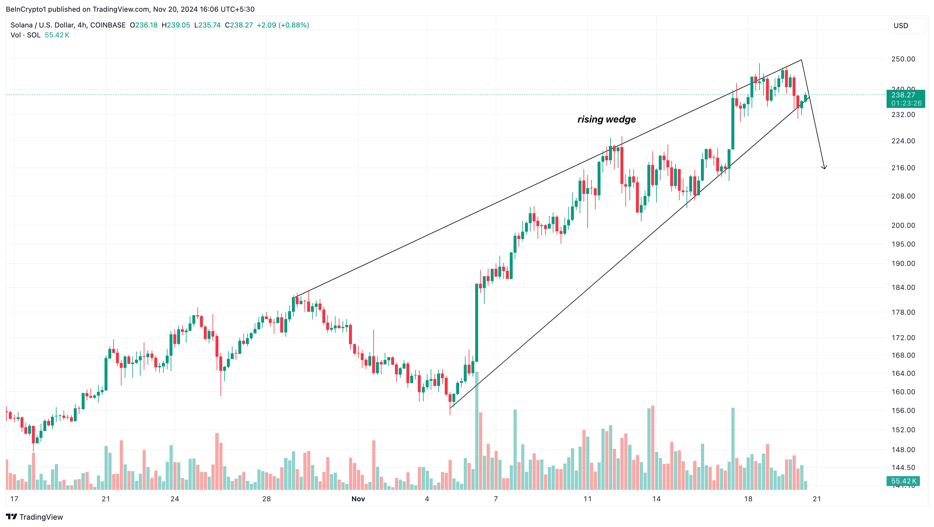 Pada grafik 4 jam, BeInCrypto mengamati bahwa pola rising wedge Solana telah muncul. Rising wedge adalah pola teknis yang umumnya dilihat sebagai sinyal bearish, menunjukkan potensi pembalikan dari tren naik.