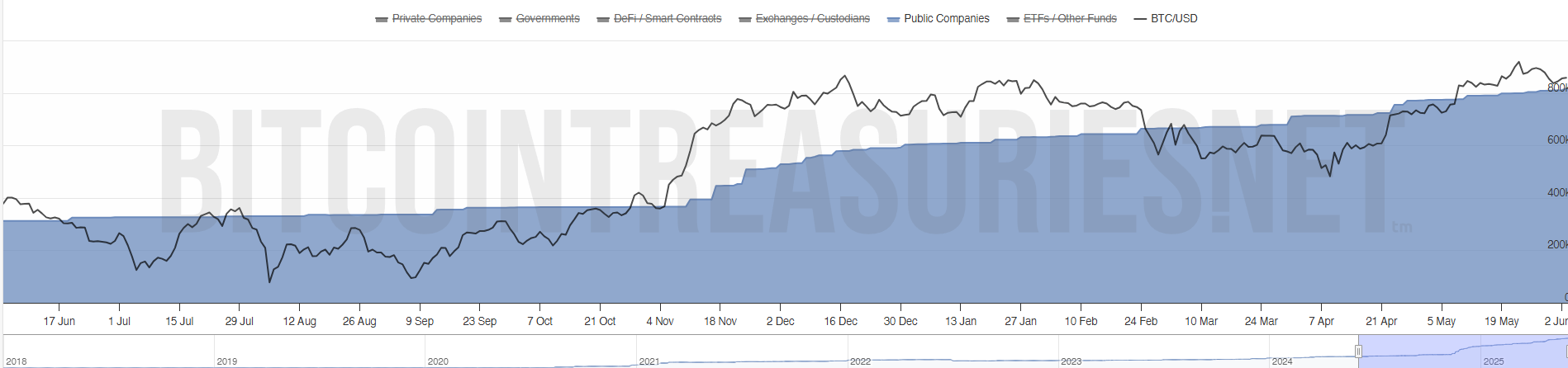 Sebuah laporan dari Standard Chartered mencatat bahwa pada akhir Mei, 61 perusahaan yang terdaftar secara publik telah mengadopsi mata uang kripto sebagai aset treasury. Secara kolektif, mereka memegang 673.897 Bitcoin—sekitar 3,2% dari total pasokan Bitcoin.