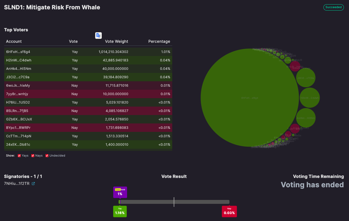 Menariknya, salah satu pihak memiliki bobot suara 1,01 juta Ya dalam voting tersebut. Karena akun tersebutlah yang menjadi satu-satunya alasan proposal tersebut dapat mencapai angka kuorum 1%.
