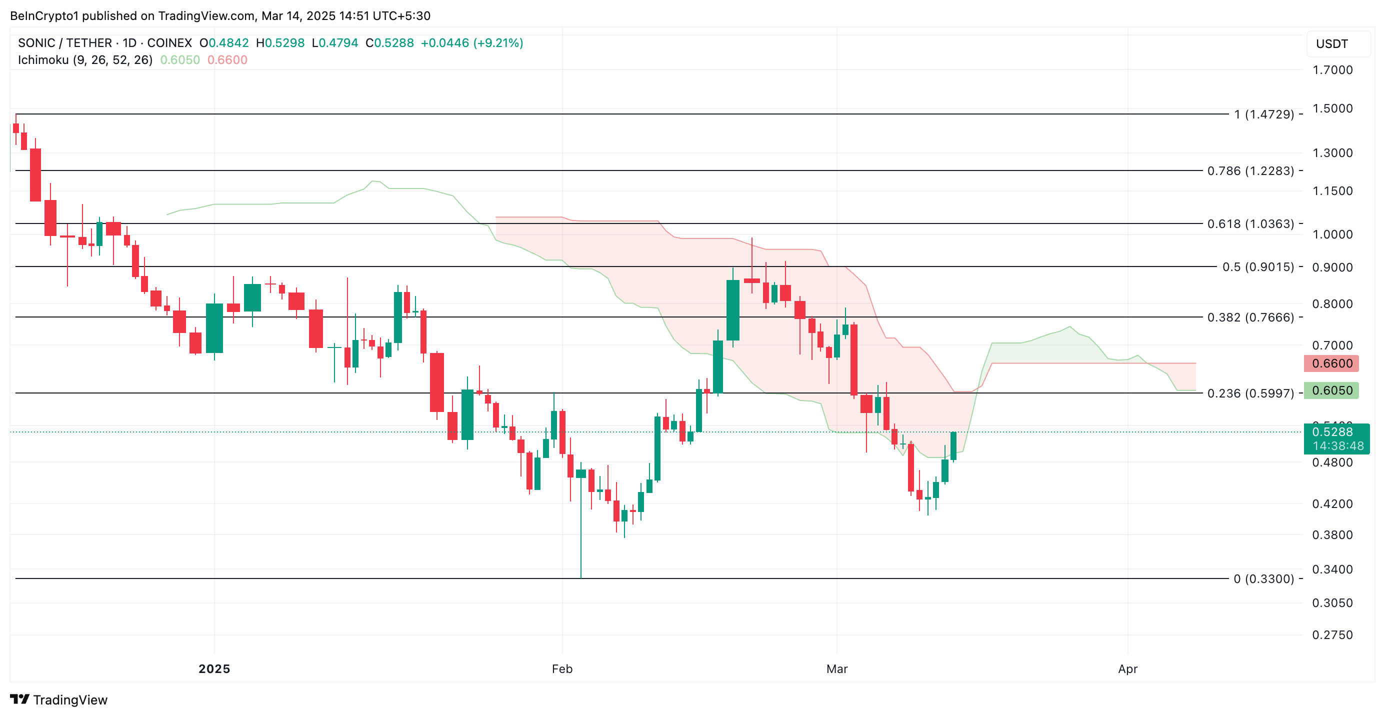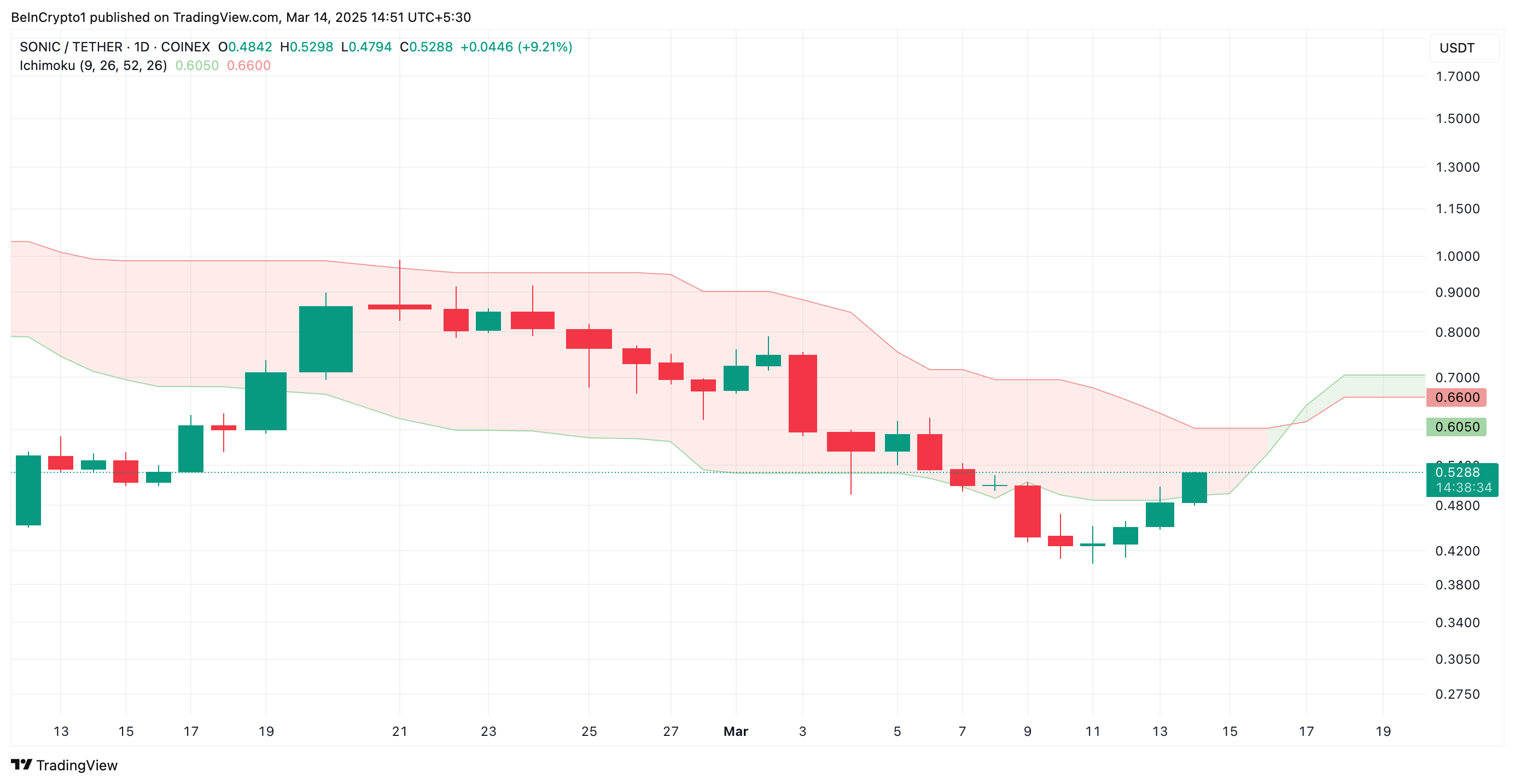 Permintaan yang berkelanjutan untuk S dapat mendorong harganya di atas resistance di US$0,59. Jika token berhasil mengubah level harga ini menjadi lantai support, ia dapat mencoba reli melampaui Leading Span B, yang membentuk resistance dinamis di atas harga S pada US$0,66.