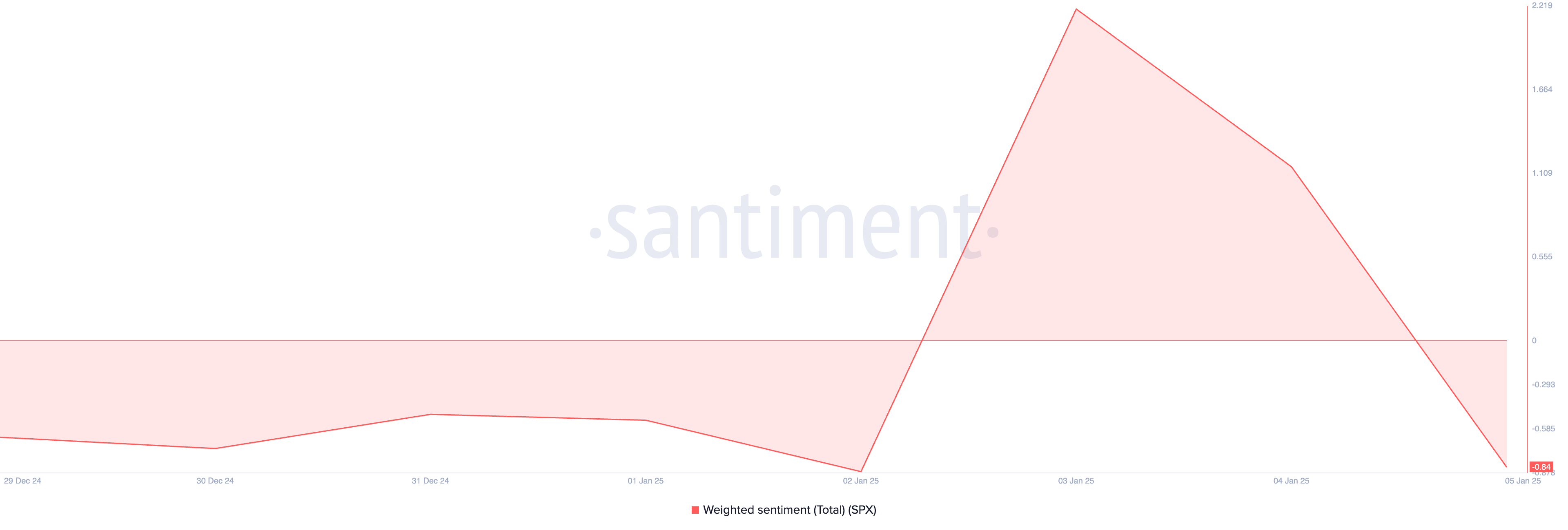 Perlu dicatat, sentimen tertimbang SPX, yang mengukur sentimen keseluruhan positif atau negatif terhadapnya, mengonfirmasi bias bearish yang berkembang ini. Pada saat publikasi, nilainya adalah -0,84.