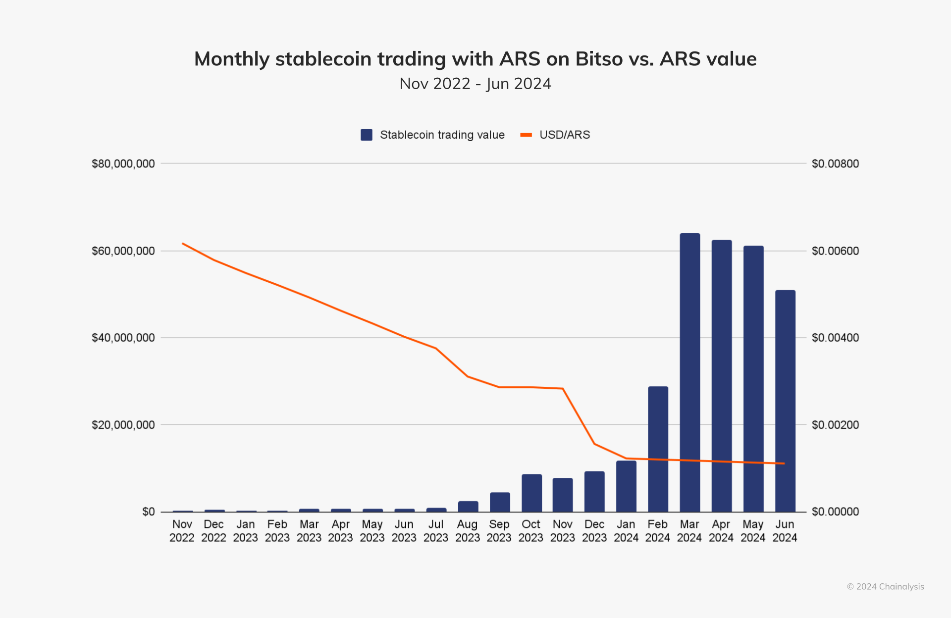 Menurut laporan Chainalysis 2024, ketika nilai peso Argentina jatuh di bawah US$0,004 pada Juli 2023, nilai perdagangan stablecoin bulanan melonjak menjadi lebih dari US$1 juta pada bulan berikutnya. Hal yang sama terjadi pada Desember 2023 ketika Presiden Milei mengumumkan dia akan mendevaluasi mata uang sebesar 50% sebagai bagian dari rencana penghematan awalnya. Bulan itu, peso Argentina turun di bawah US$0,002, dan nilai perdagangan stablecoin melebihi US$10 juta pada bulan berikutnya.