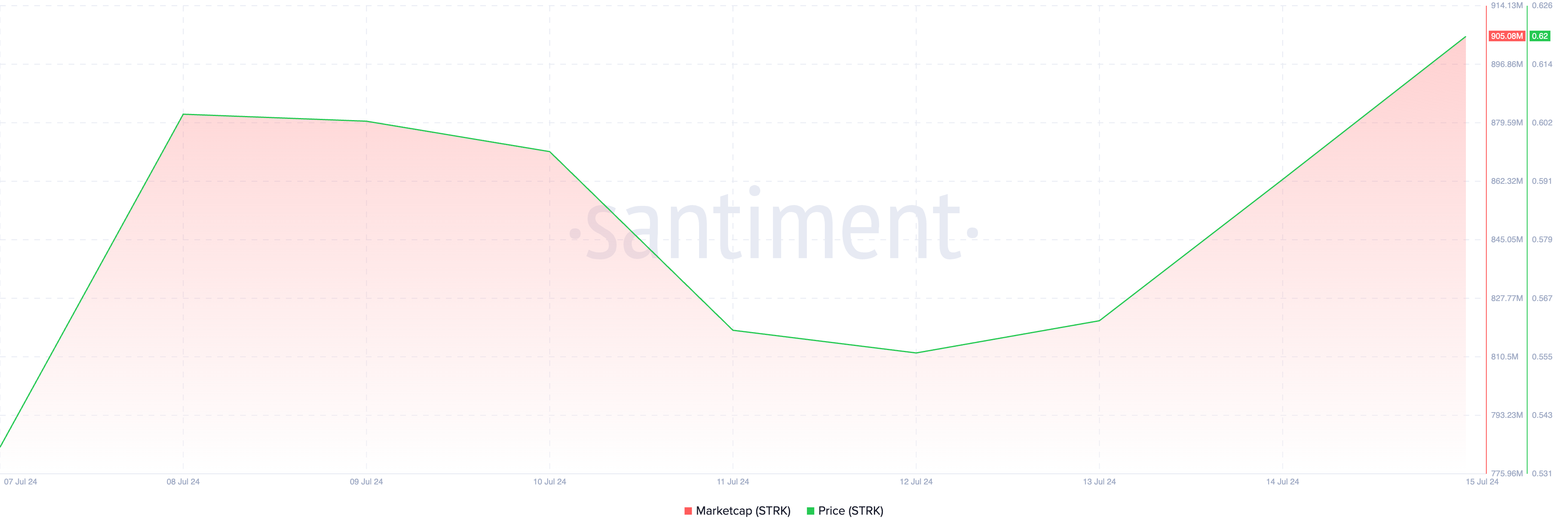 Pada waktu publikasi, market cap altcoin ini bertengger di angka US$905 juta, mewakili puncak tujuh hari terakhir. Sekarang, STRK menyandang titel sebagai aset kripto ke-71 dengan kapitalisasi pasar tertinggi.