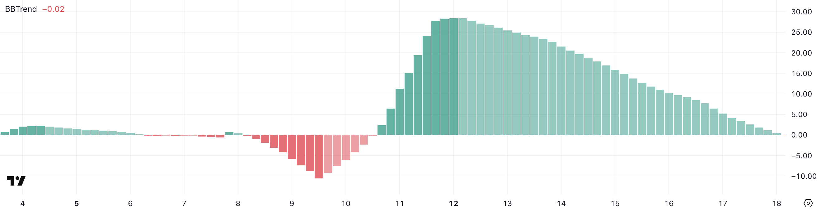 Ketika nilai BBTrend positif, hal itu biasanya mencerminkan momentum bullish. Sebaliknya, angka negatif mengisyaratkan bahwa kekuatan pasar mungkin melemah atau berbalik arah menjadi bearish.