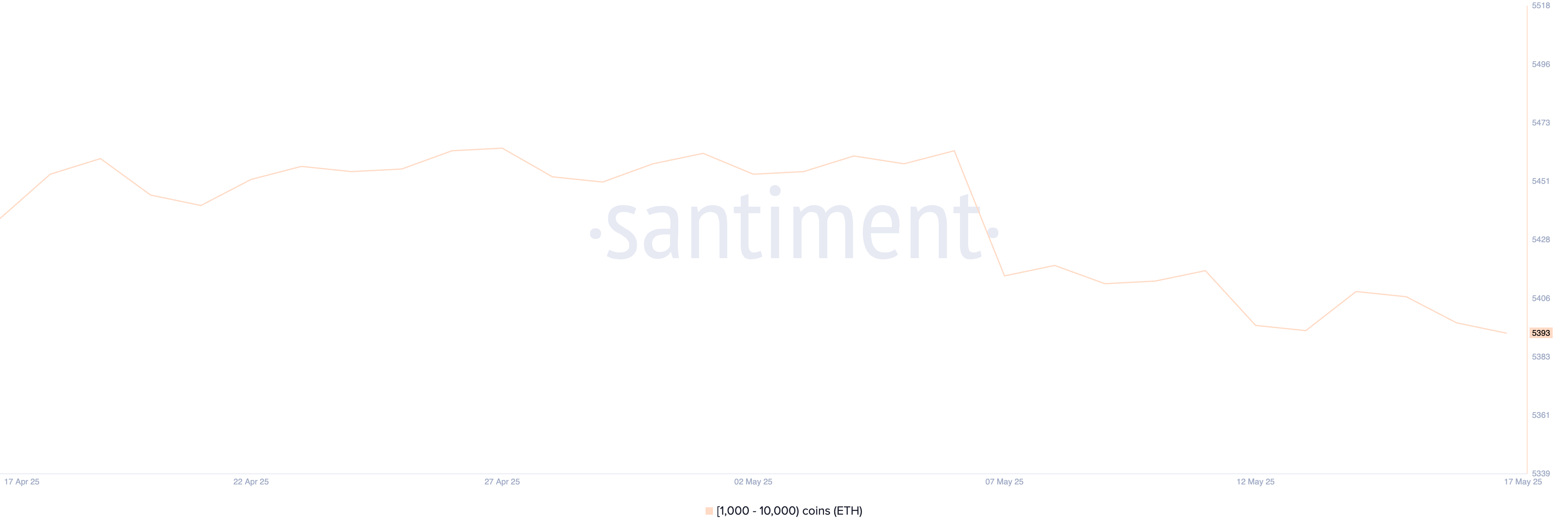 Aktivitas whale Ethereum mulai menunjukkan tanda-tanda penurunan setelah beberapa pekan relatif stabil. Alamat yang menyimpan antara 1.000 sampai 10.000 ETH—yang dikategorikan sebagai whale Ethereum—sebelumnya tetap berada di atas 5.440 sejak pertengahan April, bahkan mencapai 5.463 per 8 Mei.