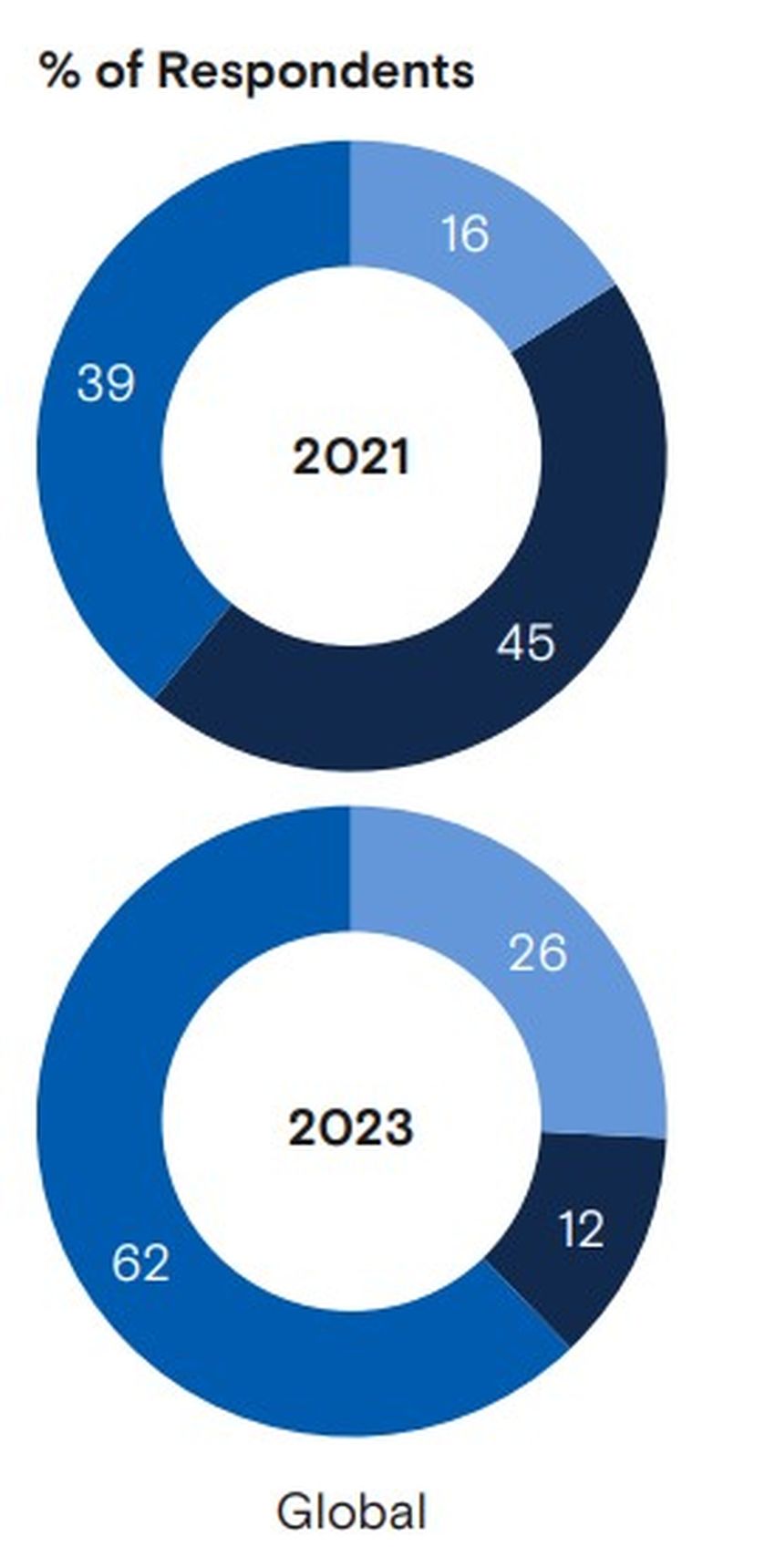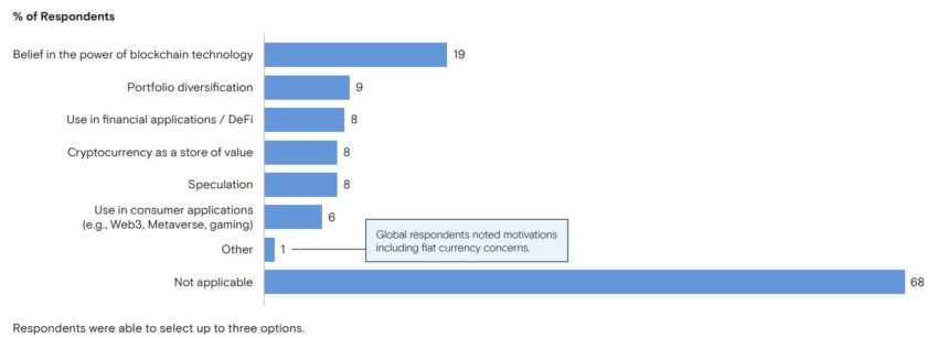 Berdasarkan data investasi global yang tersaji dalam riset tersebut, hanya 4-5% investor yang memasukkan aset kripto dalam investasi “lainnya.” Sebagai perbandingan, lebih dari 30% investor memilih ekuitas pasar publik sebagai pilihan investasi utama mereka. Untuk 2021 dan 2023, alokasi aset rata-rata responden dari seluruh dunia terdiri dari investasi dalam bentuk cash dan cash equivalent, serta pendapatan tetap.