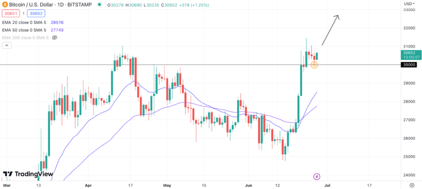 Pada saat artikel ini ditulis, Bitcoin telah melayang di sekitar level US$30,580 setelah menguji US$30,000 sebagai penopang pada hari Senin.