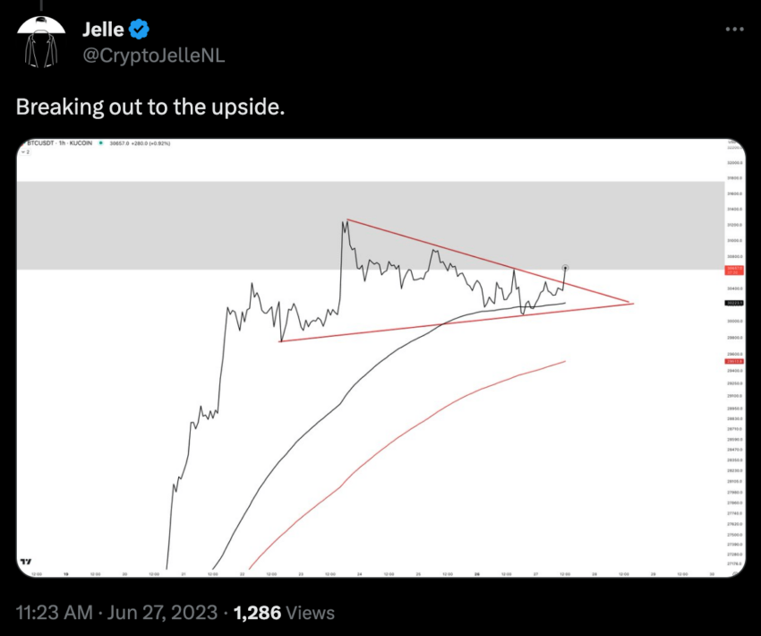 Jelle, yang memiliki lebih dari 36.000 pengikut di Twitter, juga mengunggah analisis situasi Bitcoin saat ini dan menyoroti bahwa harga saat ini sedang bergerak naik.