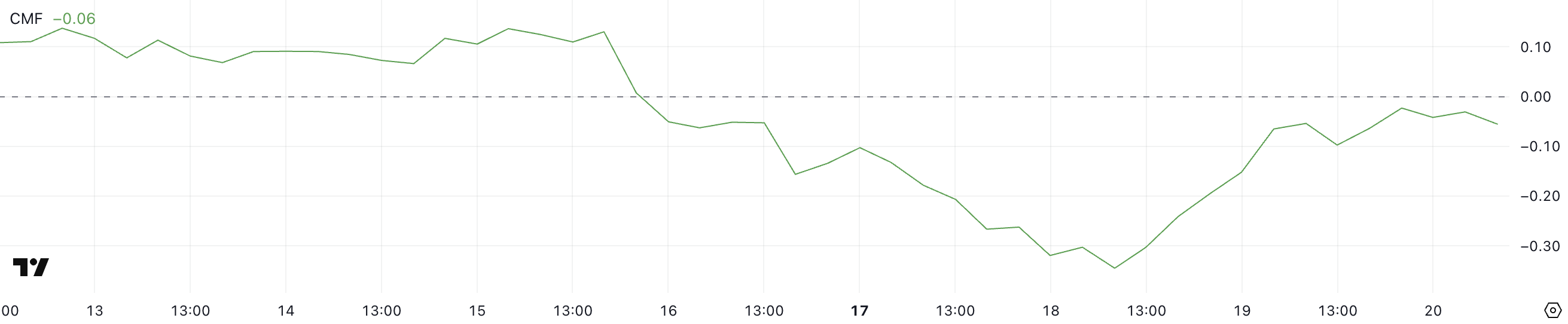CMF berkisar dari -1 hingga +1, dengan nilai positif menunjukkan tekanan beli dan nilai negatif menunjukkan tekanan jual. Biasanya, CMF di atas nol menandakan akumulasi dan sentimen bullish, sementara CMF di bawah nol menunjukkan distribusi dan sentimen bearish.