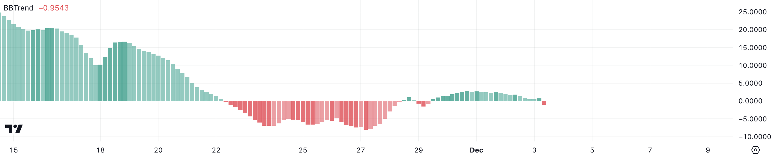 Peringatan teknis ini dapat menyebabkan koreksi harga jangka pendek karena trader sering menggunakan crossover BBTrend ke wilayah negatif sebagai sinyal jual. Namun, pembacaan negatif ekstrem juga dapat menunjukkan kondisi oversold yang kadang-kadang mendahului lonjakan harga setelah penjualan habis.