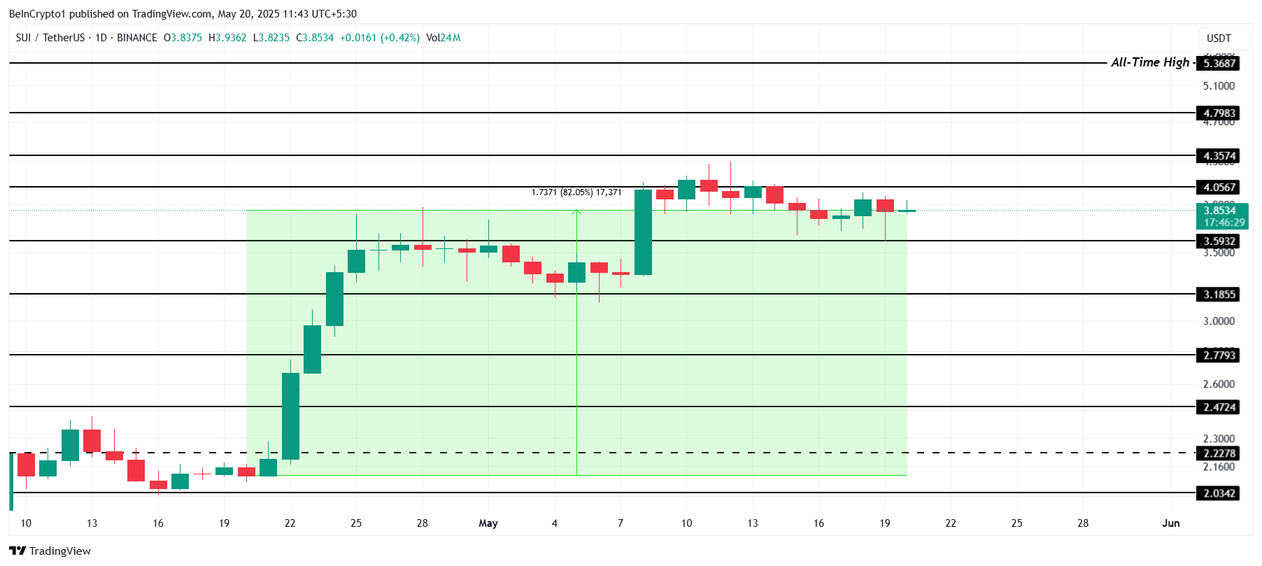 SUI telah menunjukkan kenaikan impresif sebesar 82% selama sebulan terakhir, diperdagangkan pada US$3,85 pada waktu publikasi. Meskipun menghadapi resistance di US$4,05, SUI belum mengalami koreksi signifikan, menunjukkan momentum bullish yang berlanjut.