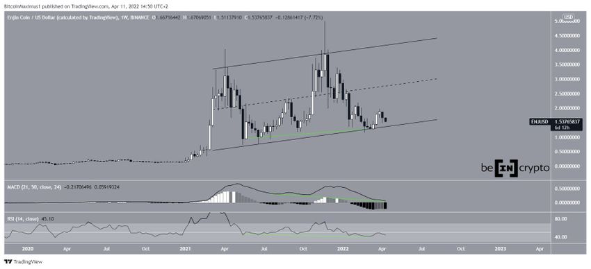 Grafik mingguan berikut menunjukkan bahwa ENJ bisa diperdagangan dalam ascending parallel channel berjangka sangat panjang. Biasanya, terdapat pergerakan korektif dalam channel seperti itu. Oleh karena itu, kondisi breakout dari channel mungkin dapat terjadi.