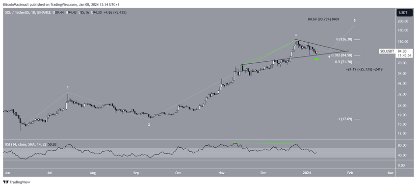 Para analis menerapkan teori Elliott Wave untuk mengkaji pola harga jangka panjang dan psikologi investor guna memprediksi arah tren. Berdasarkan teori ini, wave count yang berlaku menunjukkan bahwa SOL saat ini sedang berada di gelombang keempat dari pergerakan naik lima gelombang (putih).