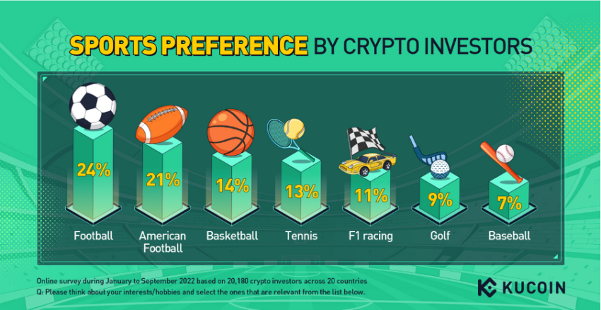 Menurut hasil survei tersebut, sepak bola adalah olahraga paling populer di kalangan investor kripto. Data menunjukkan 24% investor kripto mengatakan bahwa sepak bola adalah olahraga favorit mereka. Menurut FIFA sendiri, ada sebanyak lima miliar penggemar sepak bola di seluruh dunia, dengan Amerika Latin, Timur Tengah, dan Afrika menyabet basis penggemar terbesar.