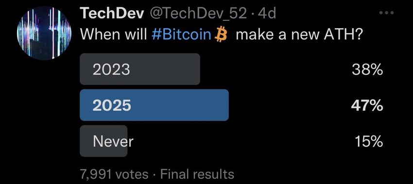 SponsoredUntuk pertanyaan “Kapan #Bitcoin [akan] mencetak ATH baru?” ada 3 kemungkinan jawaban yang tersedia: 2023, 2025, dan tidak pernah. Lalu, hasilnya adalah opsi jawaban “2025” menjadi jawaban yang paling banyak dipilih. Lebih tepatnya, ada 47% responden yang memilih opsi tersebut. Selanjutnya, opsi jawaban “2023” menempati posisi kedua dengan 38% suara. Sedangkan, opsi jawaban “tidak pernah” dengan 15% suara menjadi opsi yang paling sedikit responden pilih.