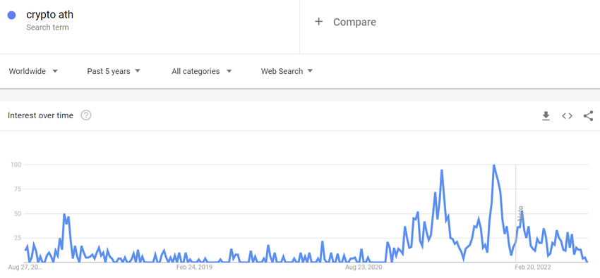 Data dari Google Trends juga mengonfirmasi sentimen yang sangat pesimistis dari pelaku pasar kripto pada survei Twitter tersebut. Jika kita melihatnya dari jumlah pencarian untuk kata kunci “Bitcoin ATH” selama 5 tahun terakhir, kita bisa menyimpulkan bahwa pencariannya telah mendekati titik terendahnya saat ini.