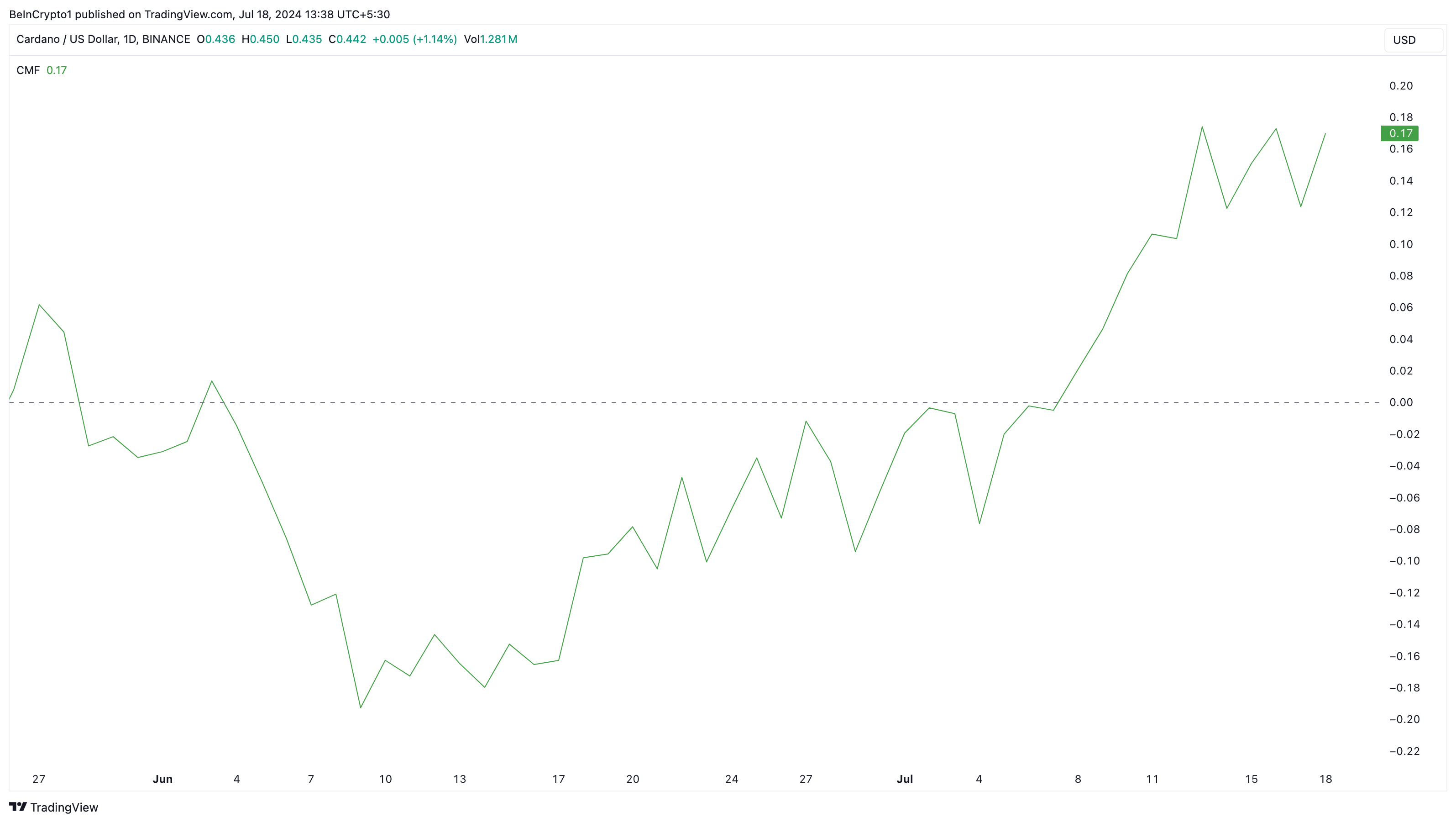 Indikator lain yang mendukung potensi kenaikan harga adalah Chaikin Money Flow (CMF), yang menilai arus masuk dan keluar dari aset kripto.