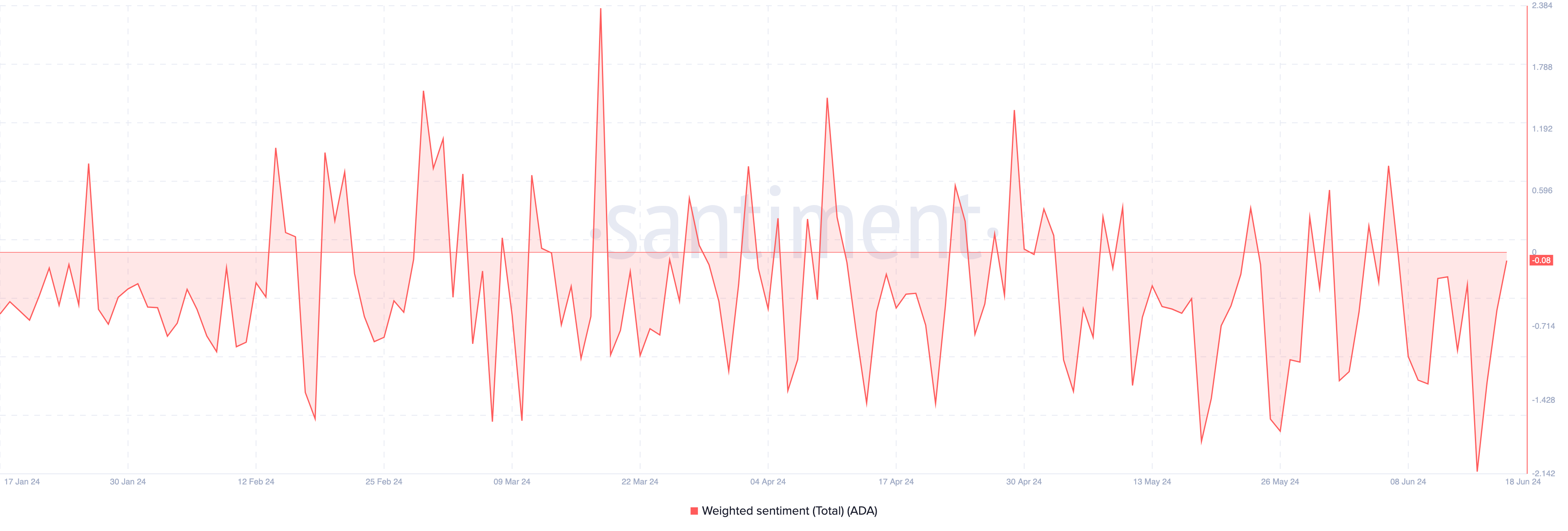Jika prediksi ini benar, ADA bisa mengalami kenaikan harga serupa dengan XRP yang naik 30,44%. Terbaru, Sentimen Tertimbang alias Weighted Sentiment telah berubah dari -1,683 menjadi -0,08, hampir mencapai zona positif.
