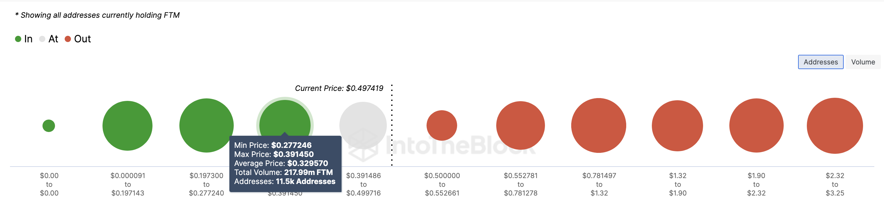 Namun, jika ada sejumlah besar alamat yang “out of the money” (menderita rugi), itu bisa menjadi titik resistance. Dari grafik di bawah ini, 11.500 alamat tercatat membeli hampir 218 juta token FTM, yakni sekitar US$0,32.