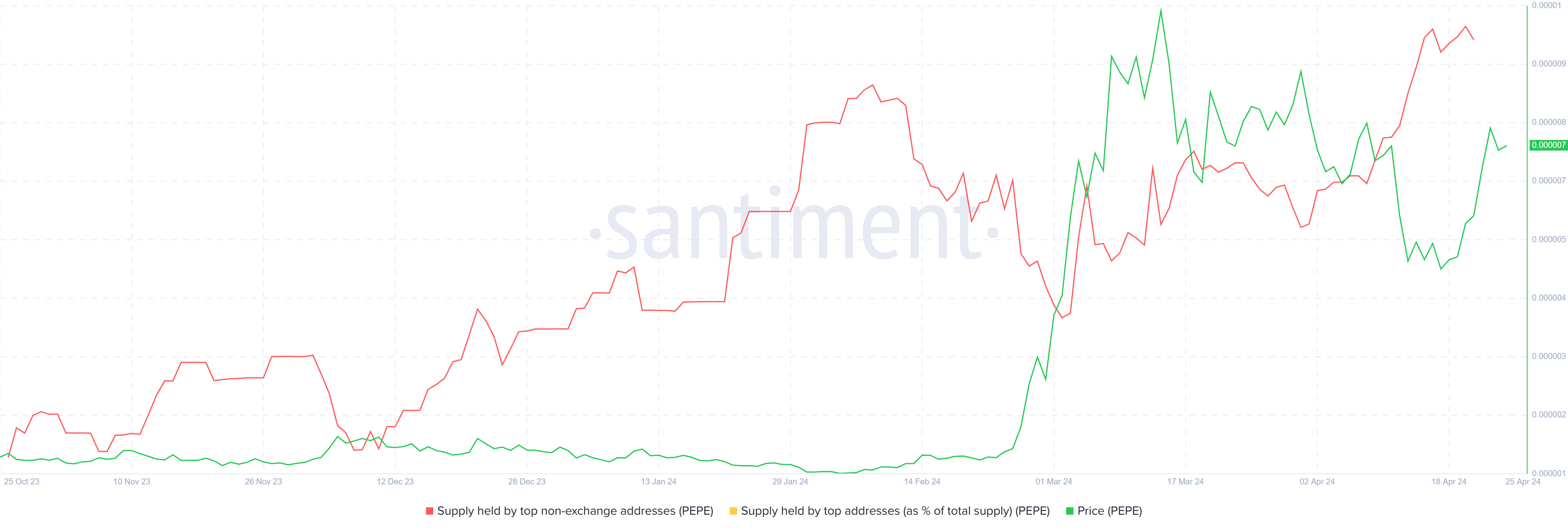 Pada saat publikasi, harga PEPE berkisar di angka US$0,00000738 dan terpantau telah mendapatkan dukungan masif dari para investornya. Para penggemar meme coin ini telah menambahkan PEPE ke dalam wallet mereka. Alhasil, aksi ini mampu menyuntikkan bahan bakar untuk reli harga yang sedang berlangsung.