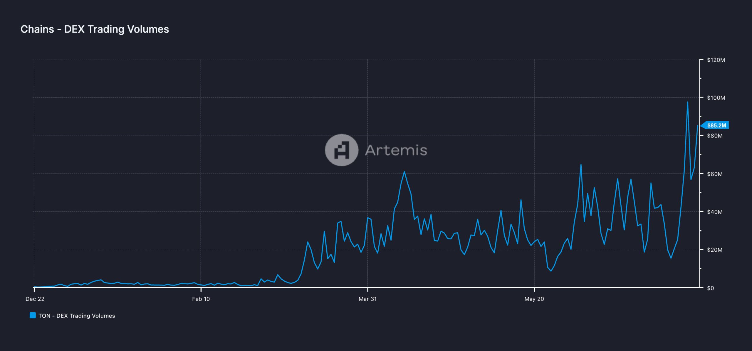 Mencerminkan ledakan aktivitas DeFi di Toncoin, volume perdagangan harian di seluruh decentralized exchange (DEX) di jaringan terdongkrak pula ke rekor tertinggi sepanjang masa (all-time high / ATH), tepatnya di angka US$97 juta pada 5 Juli.