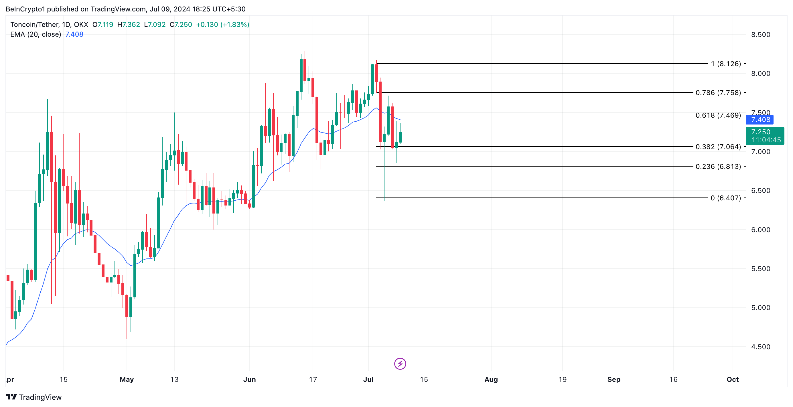 Pada saat publikasi ini, TON diperdagangkan seharga US$7,25. Penurunan pasar secara umum tak ayal telah berakibat pada ambruknya harga TON ke bawah exponential moving average (EMA) 20 hari.