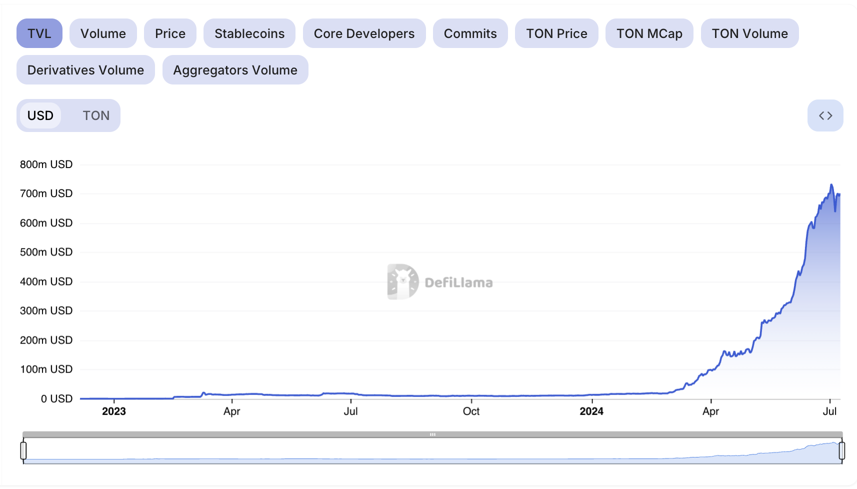 Yang menarik, Toncoin justru berhasil melawan tren ini, dan TVL-nya melejit dalam sebulan terakhir. Tepatnya tanggal 3 Juli, acara TVL jaringan membludak ke level tertingginya sepanjang masa US$723 juta. Pada level US$702 juta pada saat publikasi artikel ini. Artinya, TVL DeFi Toncoin sudah meroket lebih dari 60% dalam 30 hari terakhir.