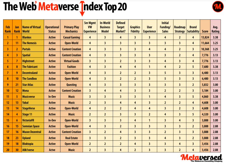 Menurut data dari indeks tersebut, terungkap bahwa metaverse Blankos masih berada di peringkat 1 dengan skor tertinggi 13,824. Metaverse Blankos sendiri masuk dalam kategori casual gaming yang menggunakan konsep play-to-earn. Menariknya, dari puluhan platform tersebut, belum ada proyek metaverse yang berfokus pada pendidikan.
