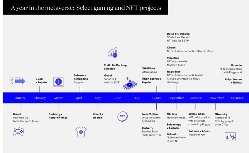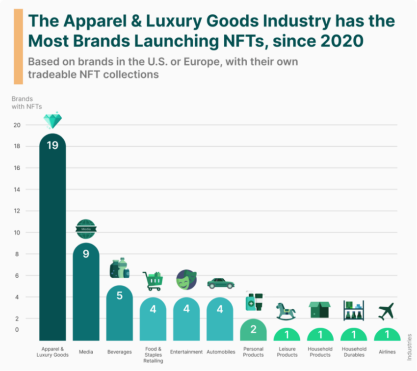 Beberapa di antara perusahaan brand mewah yang sudah bergabung dan ikut bersaing di sektor NFT yaitu Gucci, Dolce & Gabbana, Tiffany & Co., Moncler, Burberry, dan banyak lagi yang lainnya.