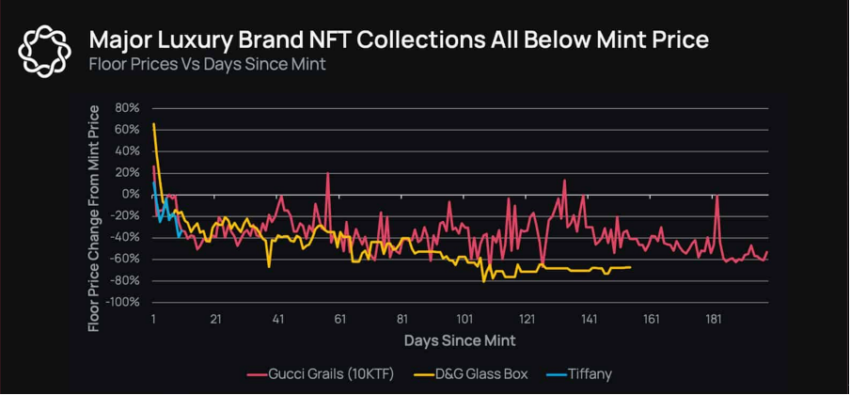 Merek-merek mewah seperti Gucci dan Tiffany & Co. terus merangkul NFT meskipun crypto winter masih berlangsung. Namun, berapa lamakah mereka akan bertahan mengingat harga dasarnya terus turun?